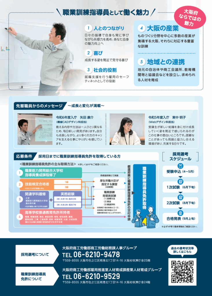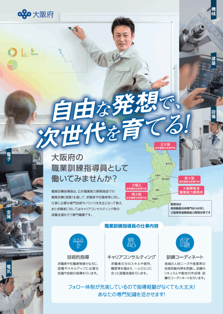 就職への支援を行う中で、自分自身の学びを深めることができ、自身の成長にも繋がる、やりがいのある仕事です。あなたの専門知識を活かして、職業訓練指導員として私たちと一緒に働いてみませんか?